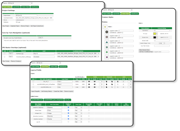 'Management' is the administrator's portal into Colligo GIS. Allowing complete control over projects, GIS layers and user access. Adminstrators can create GIS layers from scratch or import from other data sources. Define custom/conditional forms and styling per project.