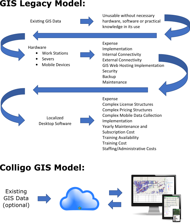 Your GIS information is extremely valuable. The expense, in both time and money, to create GIS data is substantial. The expense to maintain it shouldn't be. Unfortunately, the complexity and cost of current GIS solutions inhibit maintenance needs. Colligo GIS solves this problem by providing a secure and easy to use, cloud-based GIS platform that substantially reduces these prohibitive factors of cost and complexity.